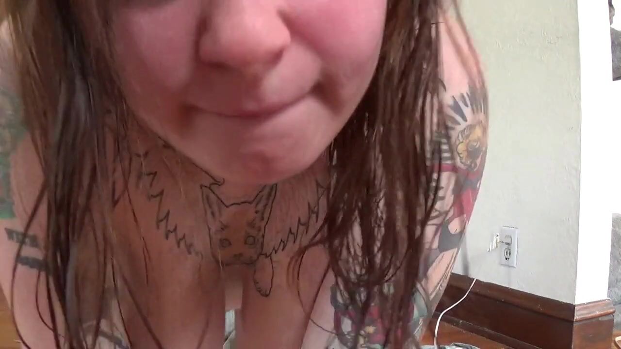 A tattooed amateur with big tits and an even bigger ass uses a Hitachi wand and a butt plug to climax in this solo webcam show.