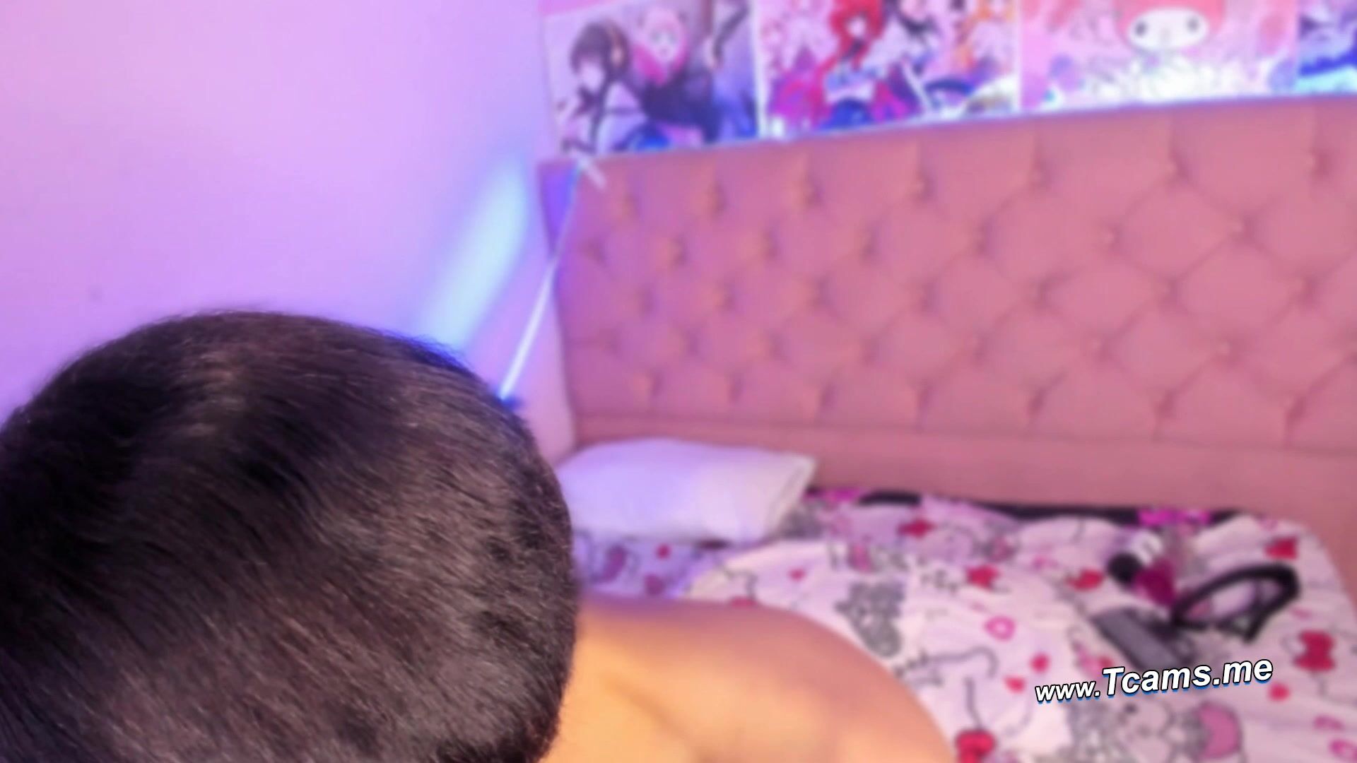 In a dimly lit bedroom bathed in soft purple LED glow, a confident trans woman with short black hair and bold red lipstick lies back on a floral-patterned bed, completely nude. Her legs are spread wide and pulled toward her chest, soles of her feet facing the camera in a teasing display. She holds a black dildo firmly in one hand, positioning it at her entrance as she prepares to penetrate herself, her smooth cock and balls visibly resting between her thighs. Her expression is playful yet intensely seductive, eyes locked on the viewer with a knowing smirk, inviting you to watch as she pleasures herself in this intimate, explicit solo video performance.