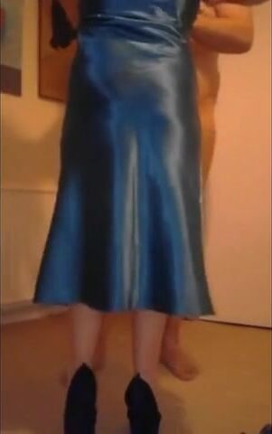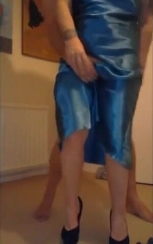 A steamy amateur video featuring a couple getting intimate, with the woman dressed in a sexy blue satin dress, the fabric adding a unique twist to their passionate encounter.
