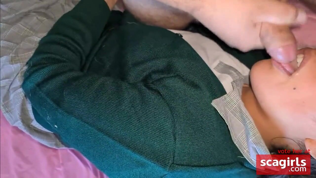 A sexy Latina babe gives a blowjob before school and swallows a mouthful of cum. This naughty student loves to suck and fuck older guys, getting their cum as a tasty treat.