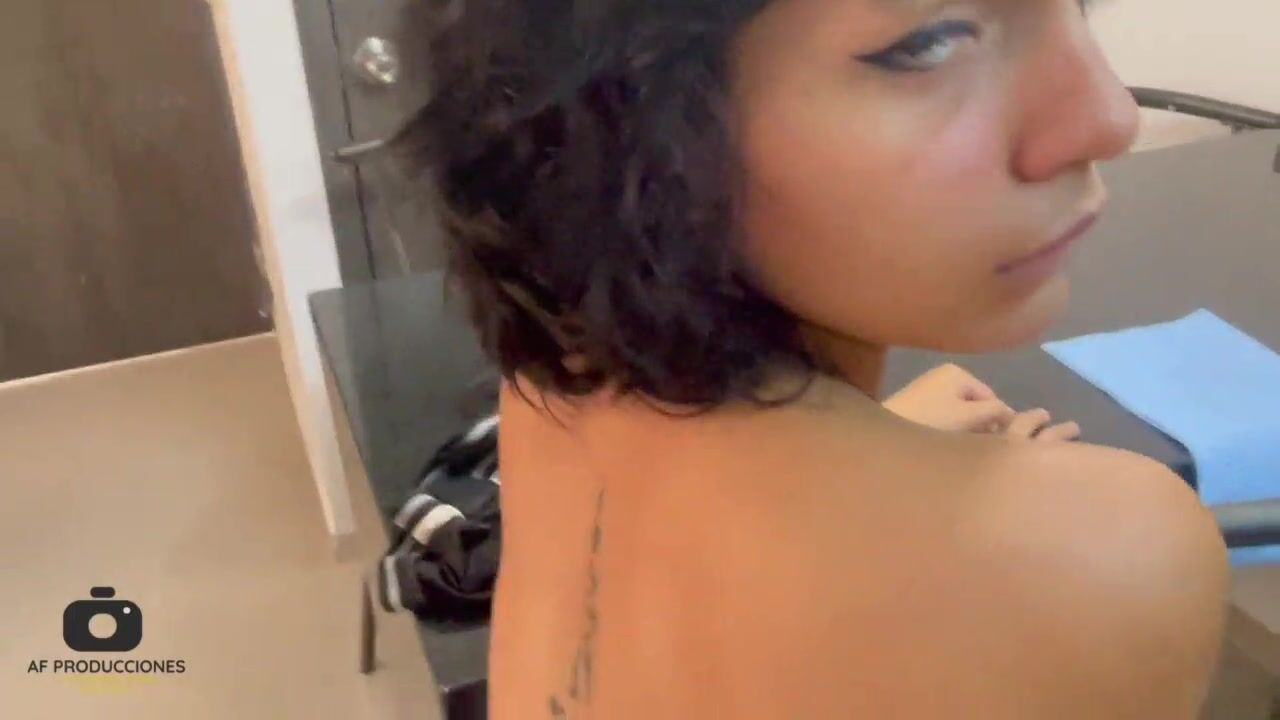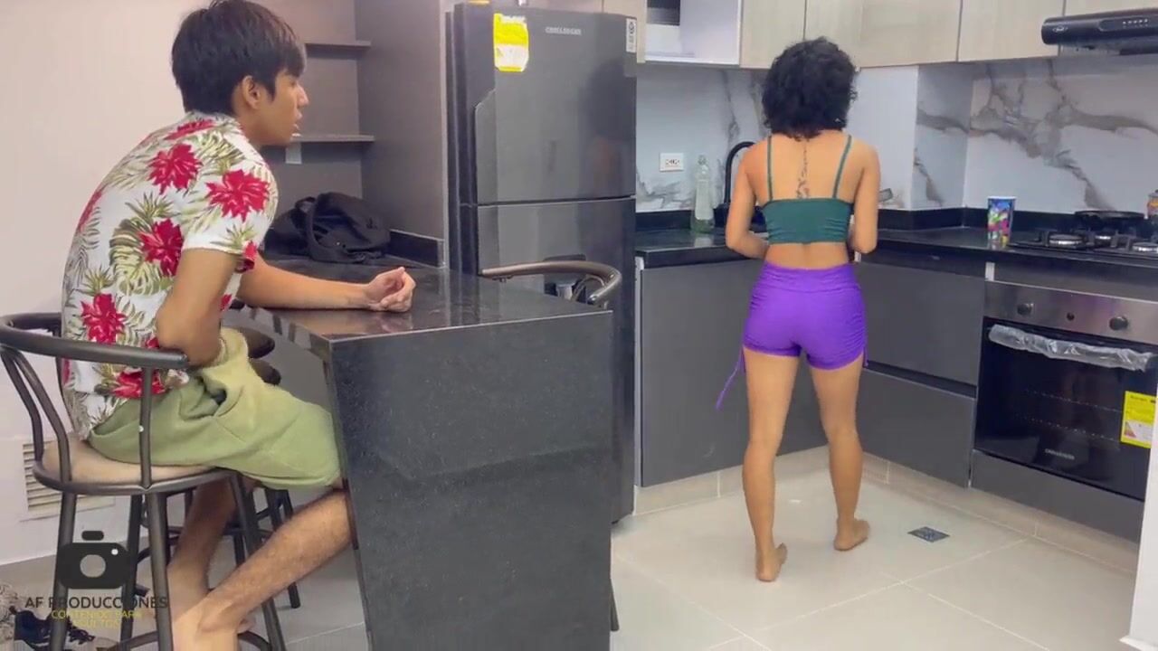 My shy stepsister catches me masturbating in the kitchen while she's making breakfast.