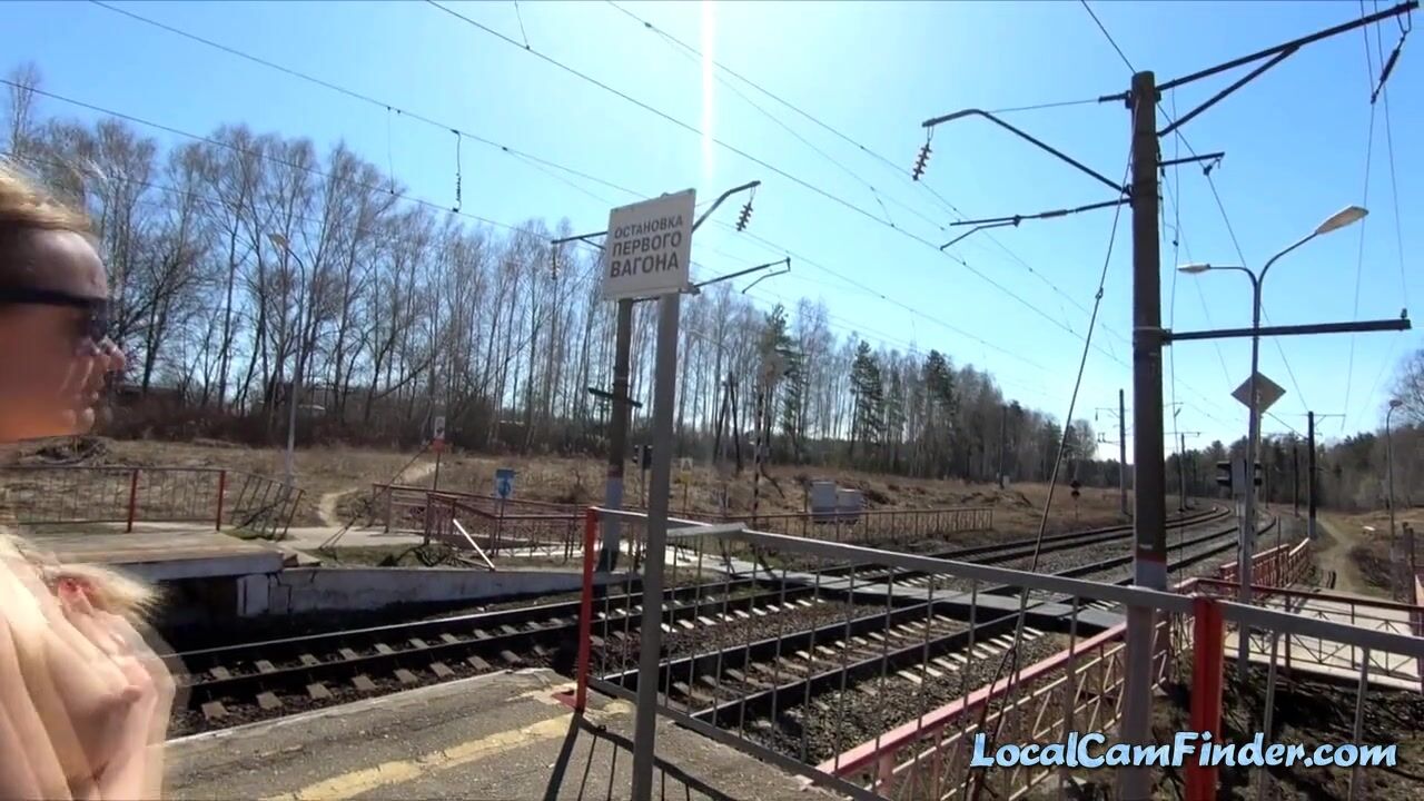A blonde Russian teen exhibitionist walks naked around a train station and along the railway tracks, showing off her small tits and pussy to the public. She's a bold amateur who loves public nudity and being watched.