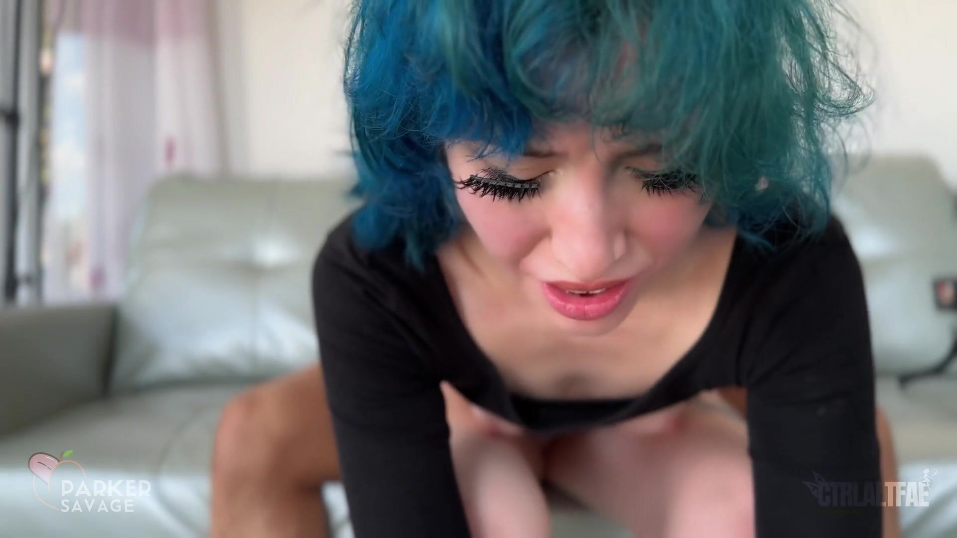 Slutty blue-haired stepsis gets her tight pussy fucked hard and a cock shoved deep in her throat